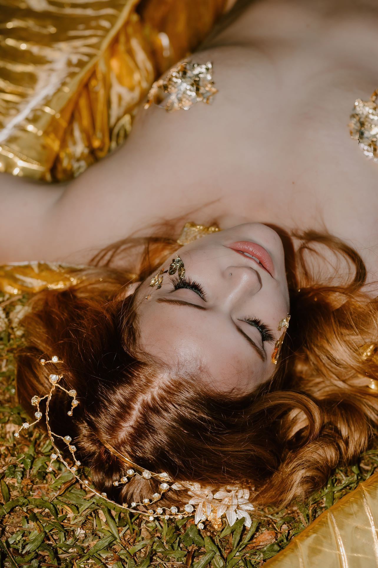 Golden leaves and multiple rhinestone vines adorn this double halo. Gold base.