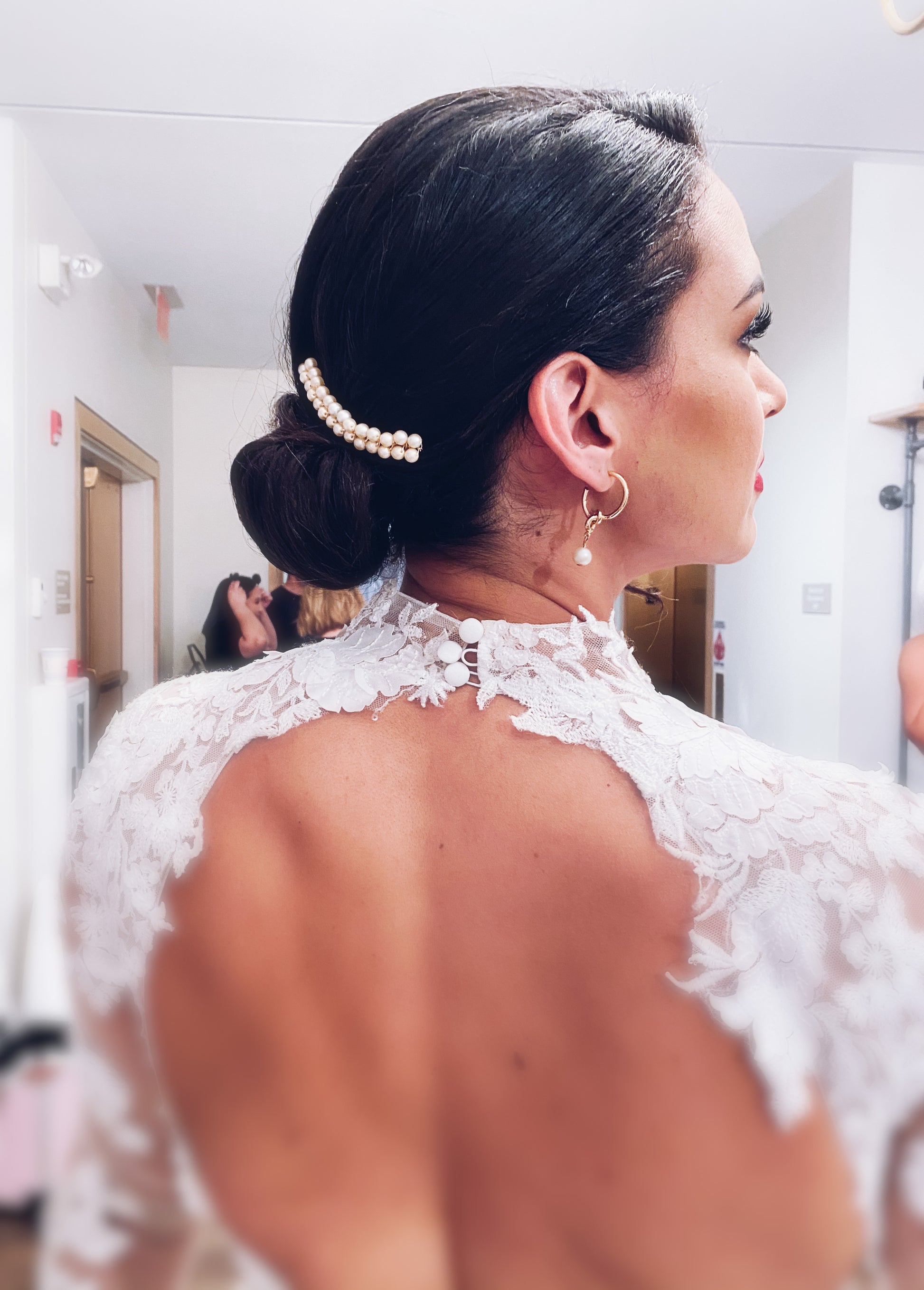 Frosted ivory glass pearls in a double row on a gold comb base. Pairs well with the love knot pearl earrings