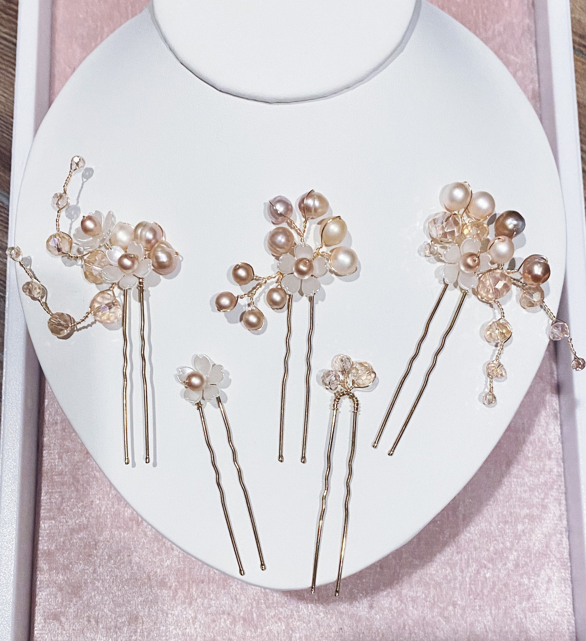 Blush pearls, white florals and blush Swarovski crystals arranged in a set of 3 large rose gold pins and two mini pins